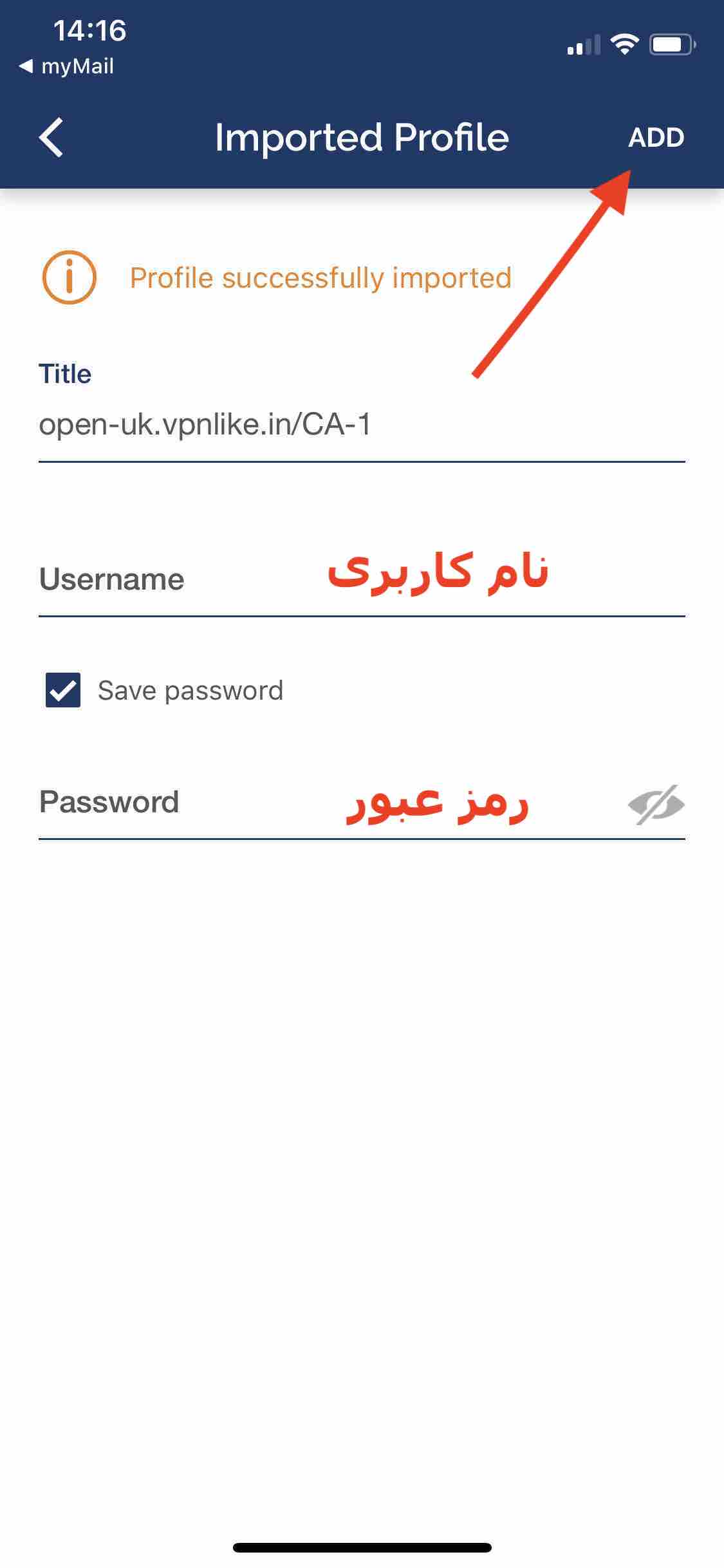 در صفحه باز شده مطابق تصویر نام کاربری و رمز عبور را وارد کرده و گزینه ADD را کلیک کنید.